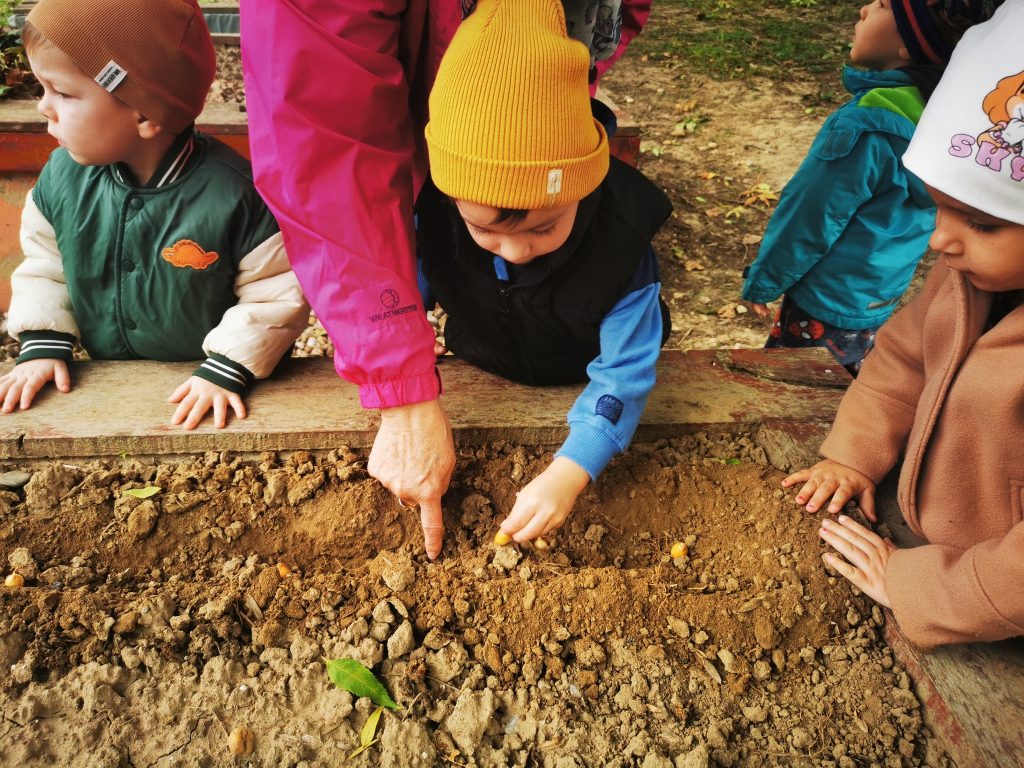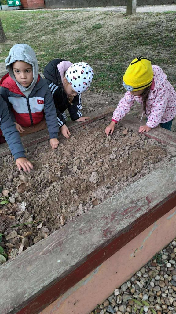 Óvodánk kertjében hagymát és borsót ültettünk, valamint megtekintettük, hogy mi van jelenleg a komposztálóban. Megismerkedtünk a komposztteával, amit a földbe keverve a gyermekek megtapasztalhatták, hogyan válik a komposzt egy része a növények tápanyagává.