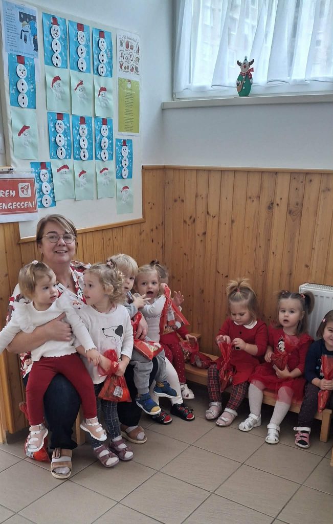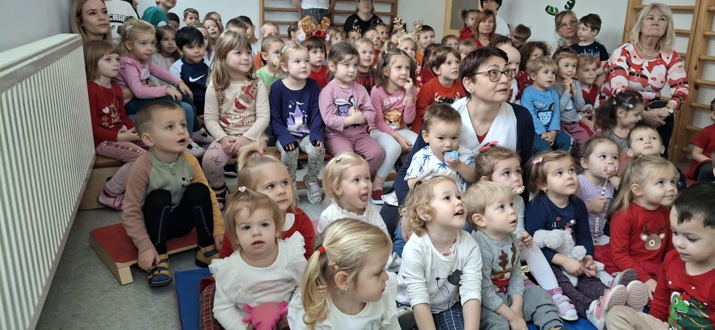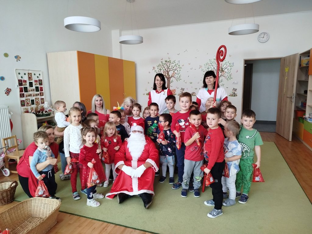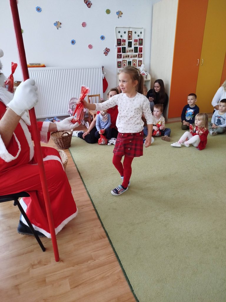 A várakozás izgalmát fokozva, az óvónénik bábszínházba invitálták az intézmény apraját – nagyját, ahol a gyerekek közreműködésével, varászmondókával, a nyulacskának sikerült eljuttatni a gyógyító teafüvet a Mikuláshoz, hogy még idejében el tudjon indulni az ajándékokkal. Mindezt közös énekléssel, jó hangulatban tettük. A csoportokba visszaérve, arra lettünk figyelmesek, hogy csengőszó hallatszik odakintről, majd az ablakhoz sereglő gyermekek örömére, megpillanthattuk a Mikulást is. A nagyszakállú intézményünk minden termébe bekukucskált, megszemlélte óvodásainkat, bölcsődéseinket, meghallgatta éneküket. Az éves jótettekért jutalmul, kis csomagokat is rejtett a csizmácskákba, ezután pedig már az öröm és boldogság pillanatai következtek gyermekeinknél.