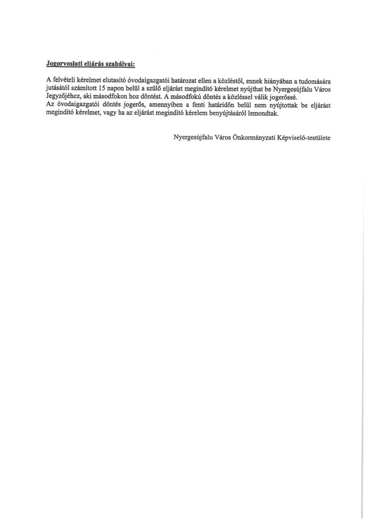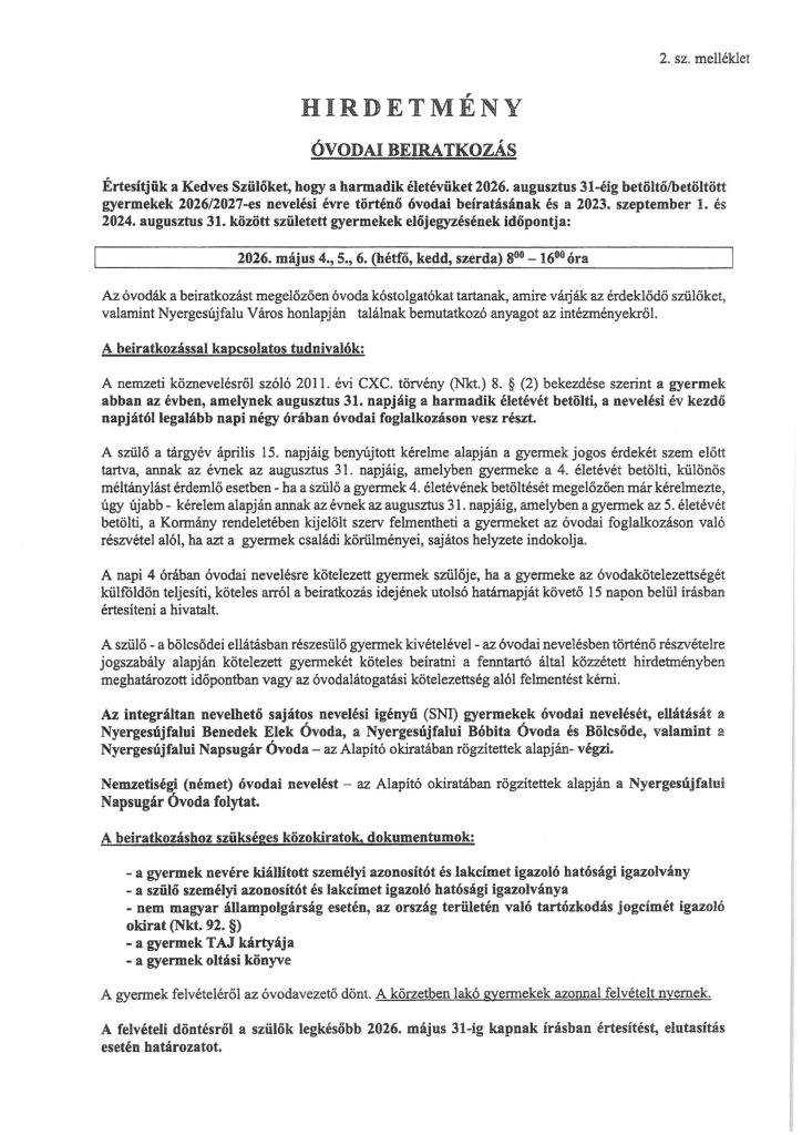 A felvételi döntésről a szülők legkésőbb 2026. május 31-ig kapnak írásban értesítést, elutasítás esetén határozatot.